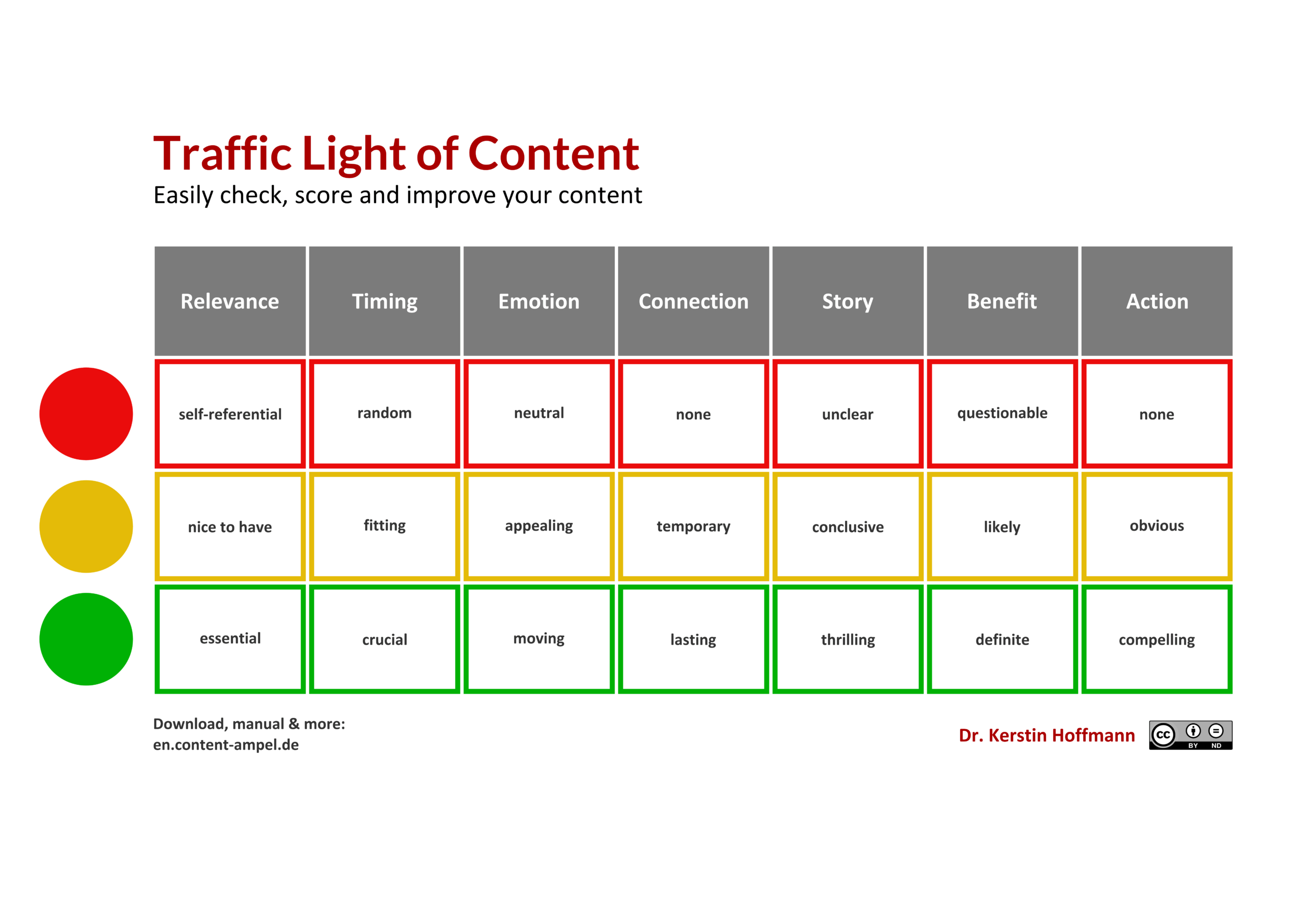 In everyday work-life, it is often difficult to adhere to the quality standards that have been set once and to implement them. This is why I developed the content traffic light. Here I present you this valuable tool free of charge – with instructions and detailed questions about all seven criteria.